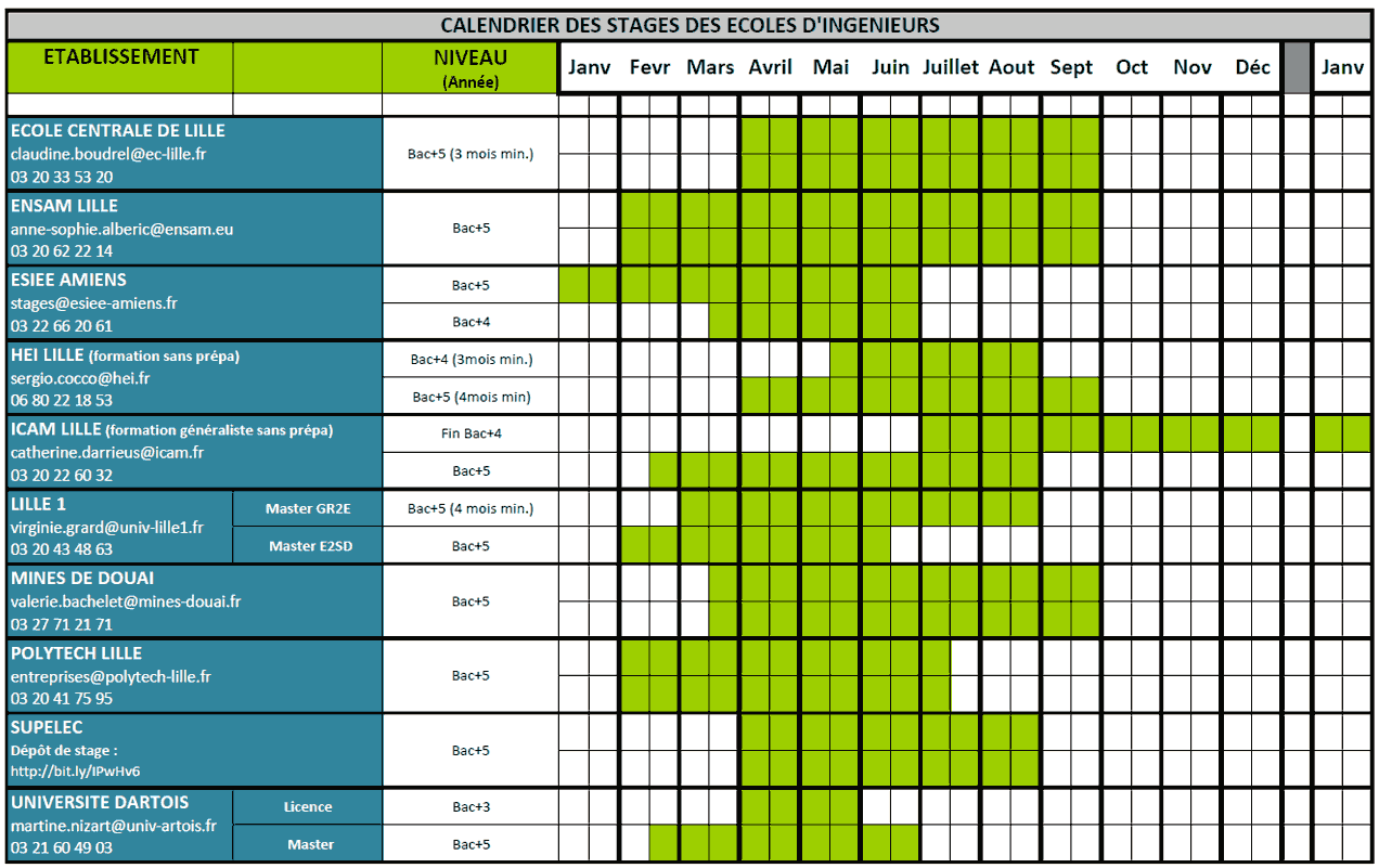 Vous trouverez ici un calendrier qui compile les dates de stage des écoles d’ingénieurs de la région. Il vous permet en un clin d’oeil de choisir une structure selon vos besoins et facilite la prise de contact avec les personnes en charge des relations « écoles-entreprises » des différents établissements.