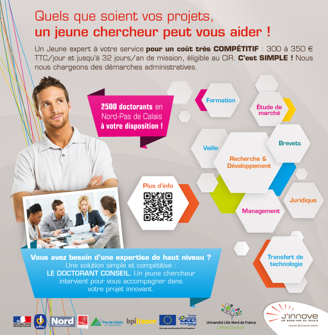 Le dispositif « doctorant conseil » vous permet de bénéficier d’une ressource performante, à haute valeur ajoutée pour un coût très compétitif (300 à 350€ TTC / jour), éligible au Crédit Impôt Recherche.