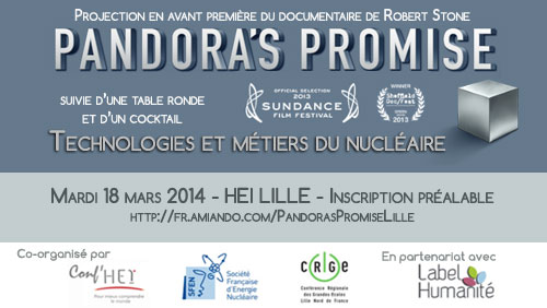 Projection en avant-première de « Pandora’s Promise » ce 18 mars à Lille. En partenariat avec la CRGE (Conférence Régionale des Grandes Ecoles), et la SFEN (Société Française d’Energie Nucléaire). Ce film documentaire américain de Robert STONE a été sélectionné au festival du film indépendant de SUNDANCE en juin 2013 où il a fait grand bruit. Il sera projeté en VO sous titré en français.