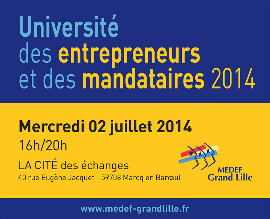 Entrepreneurs et mandataires, nous vous informons de la prochaine édition de l’Université des entrepreneurs et des mandataires 2014 organisé par le MEDEF Grand Lille à la Cité des Echanges.
