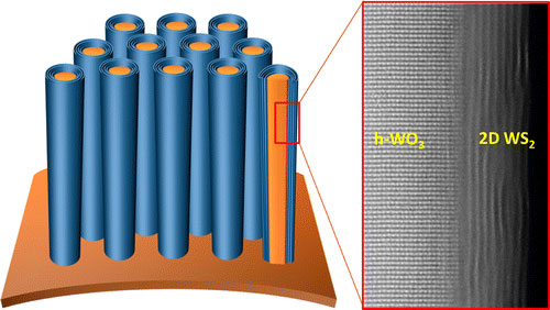 Les chercheurs de l’UCF ont utilisé des feuilles de quelques atomes d’épaisseur (ou « 2D ») de sulfure de tungstène (WS2). Il s’agit d’un métal de transition, pour recouvrir en plusieurs couches, comme des feuilles enroulées autour d’un axe, des fils nanométriques (« 1D ») conducteurs. Ces nano-fils facilitent le transfert rapide des électrons tandis que les couches de WS2 ont la fonction de stocker les électrons à leur surface. Le nombre important de couches enroulées permet d’obtenir une surface totale importante à même de stocker beaucoup d’électrons autour du fil. Le nombre total de ces nanostructures détermine ensuite la capacité de stockage globale du dispositif.