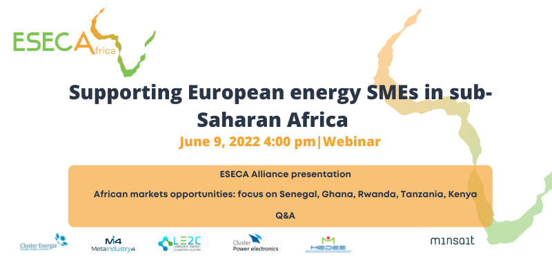 Ce webinaire vous donnera des clés pour pénétrer les cinq marchés cibles du programme : Sénégal, Ghana, Kenya, Tanzanie et Rwanda. Nous annoncerons également les prochaines étapes du projet ESECA et répondrons à vos questions sur la manière de s’impliquer dans ce programme.