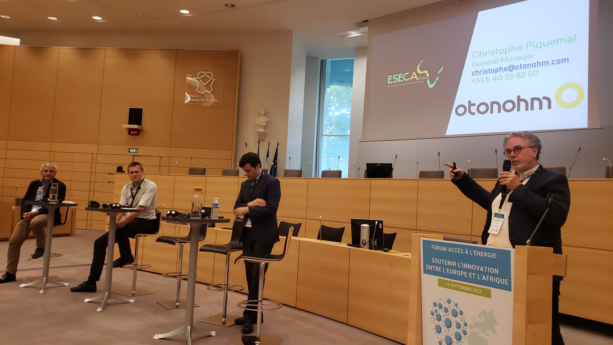 Le premier atelier de l’après-midi se concentrait sur le projet ESECA. Après une brève présentation des études de marchés des cinq pays cibles du projet (Sénégal, Ghana, Rwanda, Tanzanie, Kenya), 12 pitcheurs régionaux et européens se sont succédés pour présenter leurs structures et leurs compétences au public. Cet atelier a ainsi permis de présenter des briques technologiques d’avenir pour le développement de projets d’énergie en Afrique. Merci à l’ensemble des intervenants, en particulier nos adhérents DBT, Otonohm et Flipo-Richir.