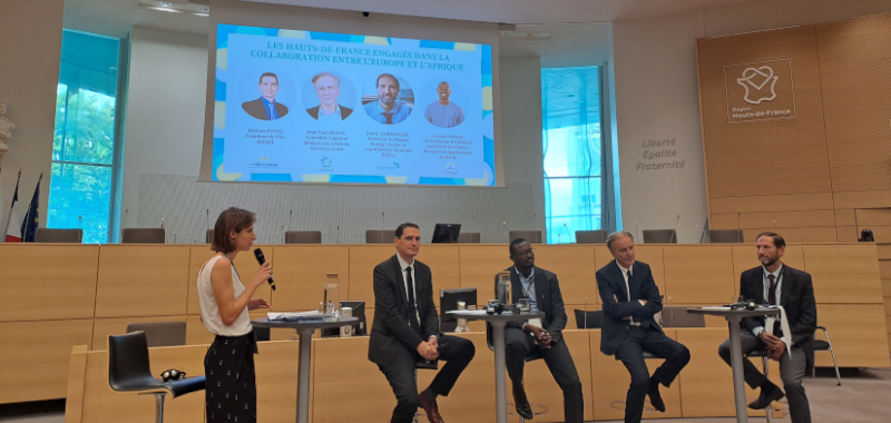 Après l’introduction de François Decoster, Vice-Président de la Région Hauts-de-France, une première table-ronde a permis de faire le point sur cinq ans d’engagement en faveur des projets d’électrification en Afrique avec les interventions de Mathias POVSE, président du pôle MEDEE, et de Jean-Paul Mulot, conseiller régional. Notre partenaire Léonide Sinsin, fondateur de la société béninoise ARESS, a ensuite introduit le projet LEOPARD, première réalisation concrète de la passerelle créée entre Hauts-de-France et Bénin par le Cluster Energies et Applications. Enfin Jose I. Hormaeche, directeur du Basque Energy Cluster, a présenté ESECA, projet de soutien aux PMEs européennes du secteur de l’énergie dans leur implantation en Afrique sub-saharienne.