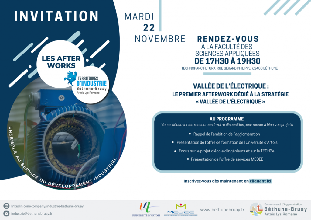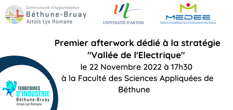 Envie d’en savoir plus sur la Vallée de l’Electrique, initiative de la Communauté d’Agglomération Béthune- Bruay Artois Lys Romane (CABBALR) ? Le pôle MEDEE a le plaisir de vous inviter à un afterwork le 22 novembre prochain pour découvrir cette dynamique !