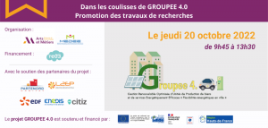 - Projet GROUPEE 4.0 avec Thomas ROLLET Ingénieur d’études – L2EP – Campus Arts&Métiers Lille et Yves MAUROY Responsable Coordination Développement – PARTENORD HABITAT : Le démonstrateur du projet GROUPEE 4.0 mené dans un logement social à Lille, combine autoconsommation collective et autopartage d’un véhicule électrique reliée à une borne de recharge bidirectionnelle.