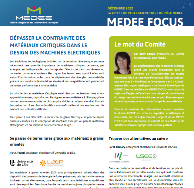 Pour son premier numéro, le MEDEE FOCUS s’était penché sur l’analyse et la maintenance vibro-acoustique des systèmes électriques. La deuxième édition s’était concentrée sur l’électronique de puissance dans les réseaux électriques de demain. Enfin, la troisième édition portait sur la fabrication additive pour les composants magnétiques du génie électrique.