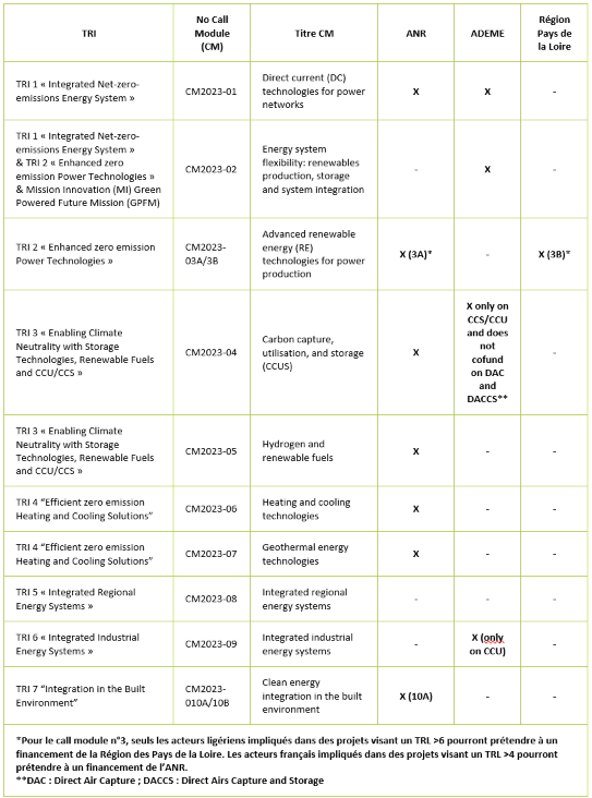 L’ANR, l’ADEME et la Région Pays de Loire contribuent à un certain nombre de ces « call modules », comme indiqué dans le tableau ci-dessous :