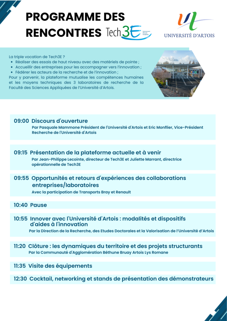 L’Université d’Artois s’est dotée d’une plateforme dédiée à l’environnement et à l’éco-efficacité énergétique : Tech3E. Reposant sur les compétences de 3 laboratoires, Tech3E offre des prestations de recherche, de développement et d’innovation aux entreprises dans trois grands domaines :