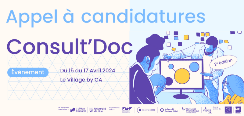 Consult’Doc, c’est la rencontre entre les entreprises publiques ou privées de la région Hauts-de-France et les jeunes chercheur·euses autour de sujets d’innovation. Il contribue ainsi à une meilleure connaissance réciproque. Consult’Doc est un séminaire de 3 journées ouvert pour 8 entreprises et 32 doctorant·es maximum.