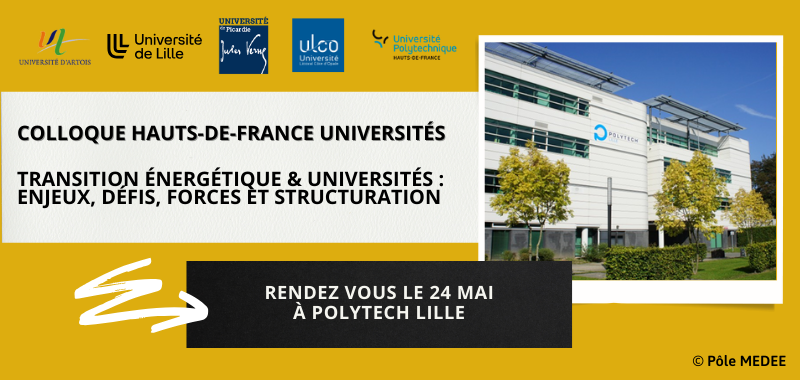 Save the date ! Le 24 mai 2024, les cinq universités de la région, associées sous le vocable de « Hauts-de-France Universités », organisent leur deuxième colloque annuel à Polytech Lille. Il est intitulé « Transition Énergétique et Universités : enjeux, défis, forces et structuration ». L’objet sera de présenter un état des forces en recherche et enseignement, ainsi que d’échanger sur les enjeux dans ces domaines pour notre région.
