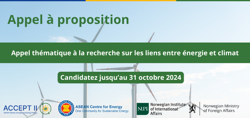 Le Center for ASEAN Energy Research – UP souhaite approfondir sa production de connaissance sur des projets transversaux énergie-climat. Cela s’inscrit dans la seconde phase de son projet ACCEPT (ASEAN Climate Change and Energy Project). Pour y parvenir, ils lancent un appel à proposition ! L’objectif ? Inviter les chercheurs à soumettre des propositions d’articles académiques sur des sujets pertinents dans les secteurs de l’énergie et du climat.