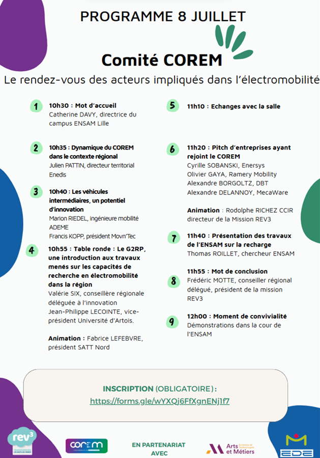 Le Comité COREM revient pour une nouvelle édition le mardi 8 juillet 2025, de 10h30 à 12h30, au Campus Arts & Métiers de Lille. Organisé par le COREM et la Mission REV3 et en partenariat avec les Arts et Métiers et le Pôle MEDEE, cet événement réunira entreprises, institutionnels et chercheurs autour des dynamiques locales en matière d’électromobilité.