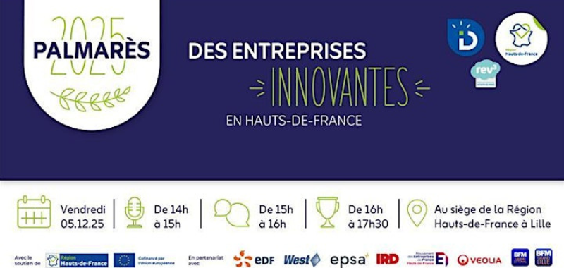 Le Palmarès 2025 des Entreprises Innovantes Hauts-de-France, organisé par Hauts-de-France Innovation Développement (HDFID), aura lieu le 5 décembre au siège de la Région, à Lille. Cette édition mettra en lumière les entreprises finalistes et leurs projets, sélectionnés pour leur apport économique, sociétal ou environnemental au territoire. Plusieurs distinctions seront remises, dont les prix “Impact économique”, “Impact sociétal / environnemental”, le prix du jury, le prix du public et un coup de cœur de la recherche collaborative.