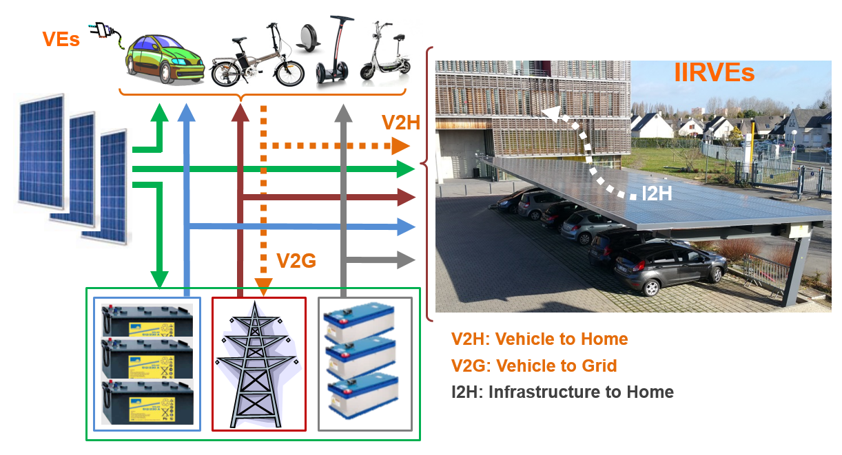 Avec le déploiement de la mobilité électrique, les villes s’interrogent sur les stratégies de fonctionnement à associer aux infrastructures de recharge des véhicules : V2G (Vehicle To Grid, injection dans le réseau de l’énergie stockée dans la batterie du véhicule électrique), V2H (Vehicle to Home, injection dans le bâtiment de l’énergie stockée dans la batterie du véhicule électrique) et I2H (Infrastructure to Home, alimentation du bâtiment directement par l’infrastructure).