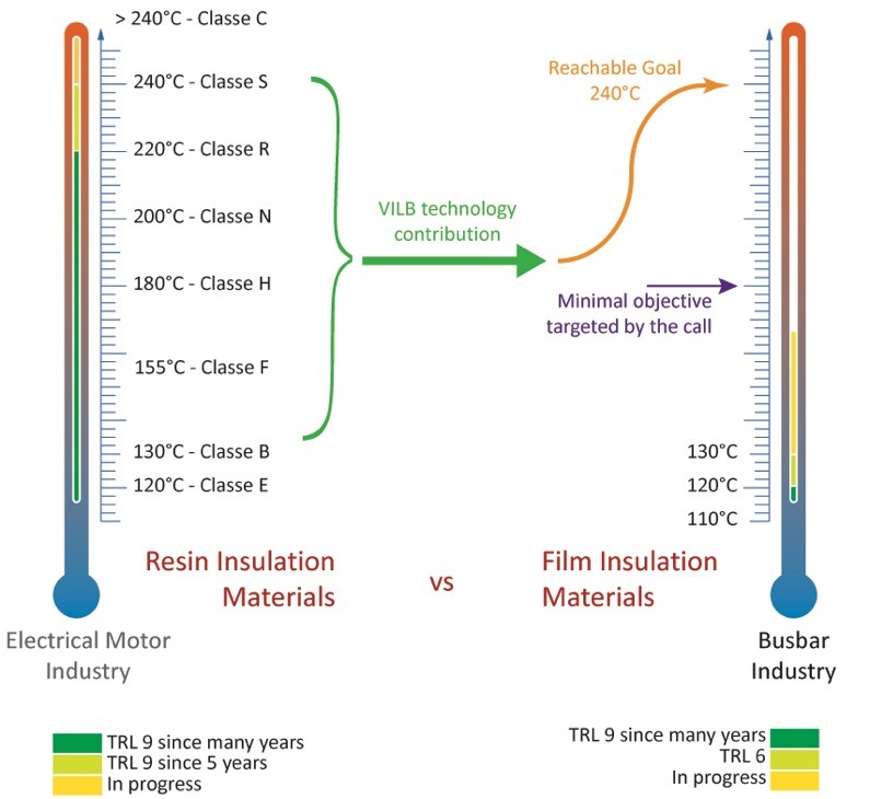 La technologie VIB permet de répondre efficacement aux problèmes précédemment évoqués. Il s’agit de remplacer les films isolants, la colle et le procédé d’assemblage complexe avec une presse chauffante, par une technologie d’imprégnation qui utilise une résine diélectrique qui est certifiée à des températures nettement plus élevées que les limites actuelles des LBB collés.